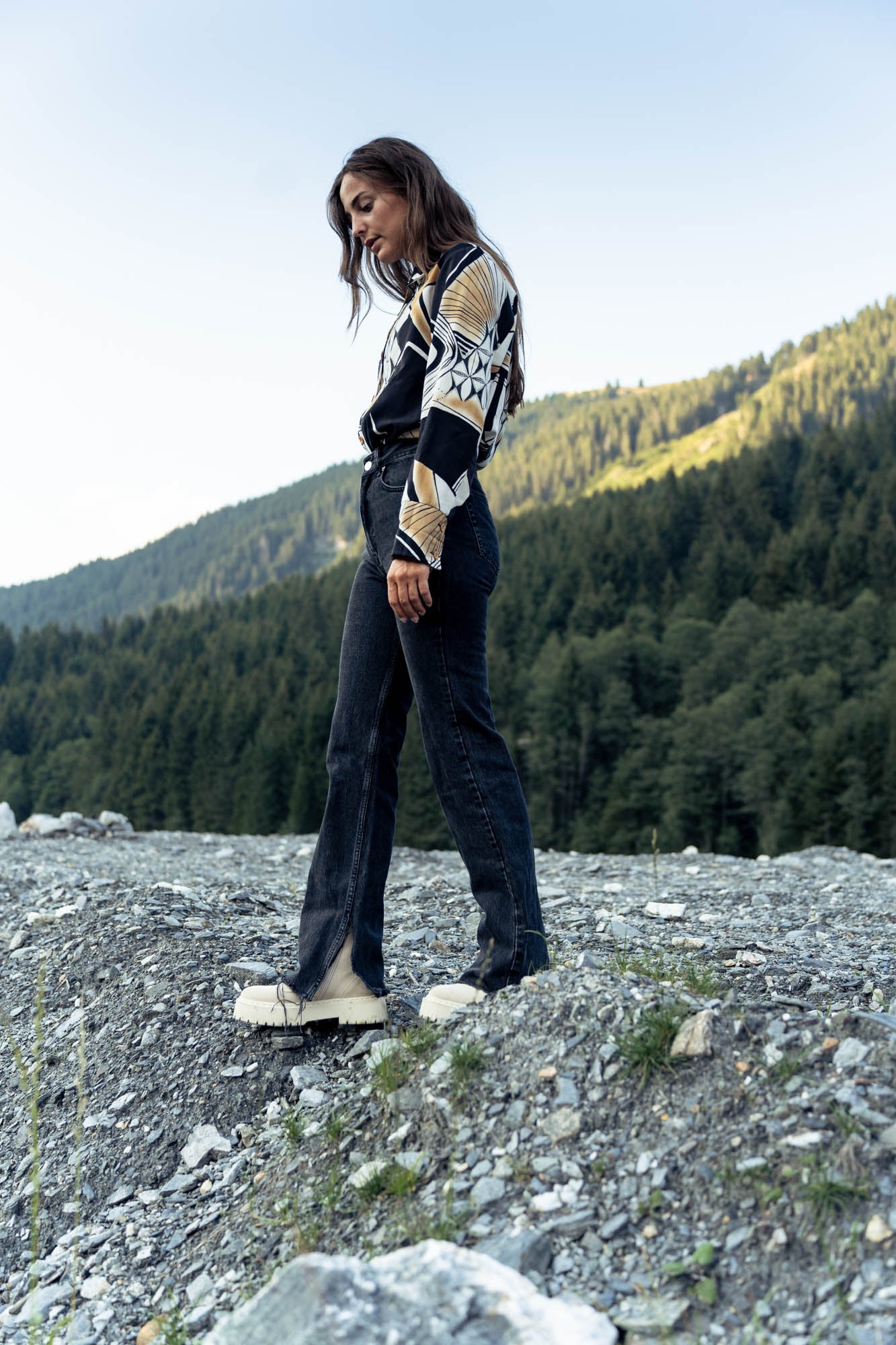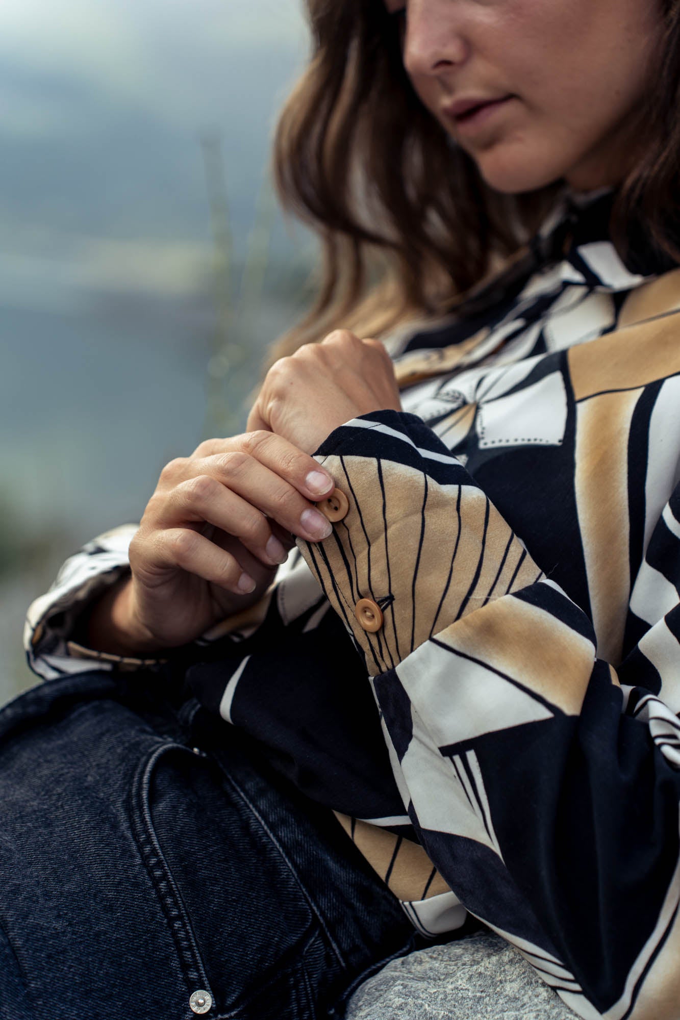The blouse has a classic collar, long sleeves and button closure. The cheerful pint with abstract retro influences creates a vintage look. Wear with a turtleneck during the colder days.