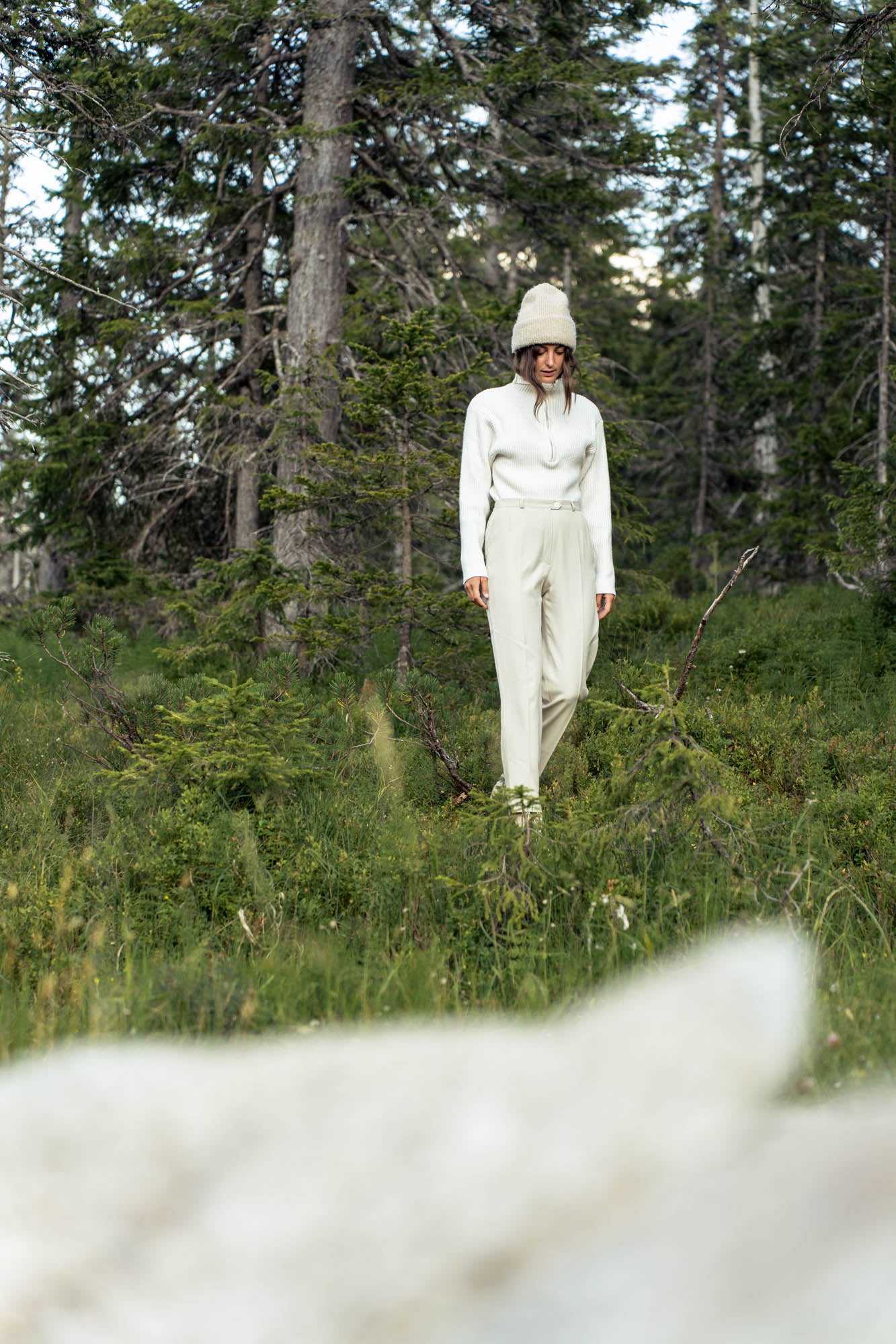 Warm and soft white sweater with high turtleneck and zipper. The sweater is ideal to wear under a blouse to create layers in the outfit. A warm coat over it and you are ready for the colder autumn and winter days.