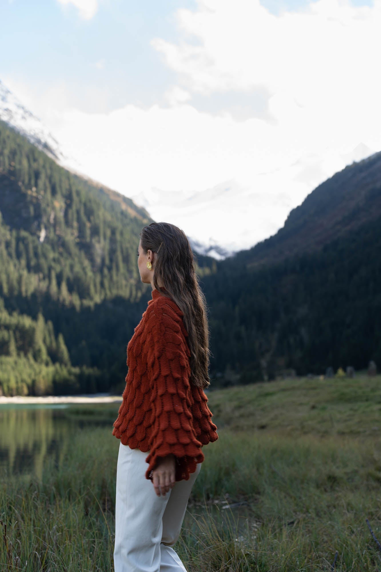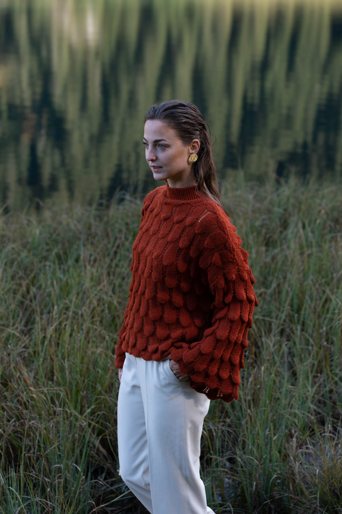 Rode gebreide trui met wijde mouwen